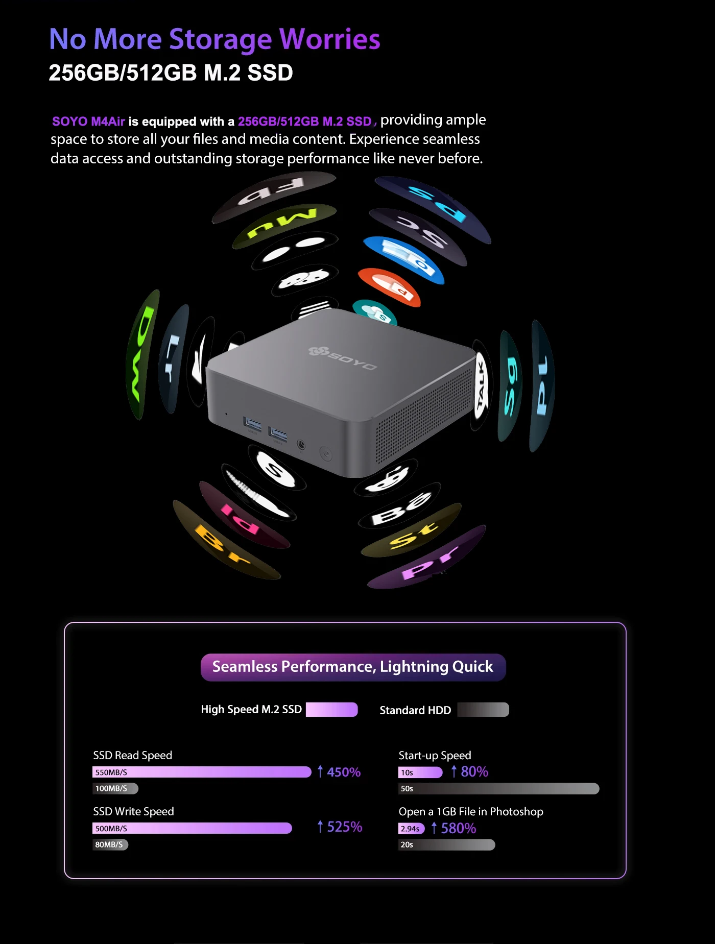 At the core of the SOYO M4 Air sits the Intel Alder Lake N95 processor. This Intel N95 CPU offers a strong processor main frequency of up to 3.4GHz, ensuring fast response for daily tasks. Furthermore, the processor brand Intel guarantees long-term software support and compatibility. Combined with Windows 11 Pro, the system feels modern and efficient. Therefore, users comparing price and performance often choose this mini PC for offices and commercial environments. In markets like the US, UK, and Germany, the SOYO Mini PC Computer M4 Air stands out for stable processing power.DDR4 8GB RAM Storage